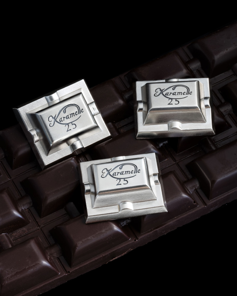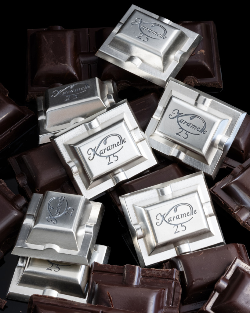 To celebrate their manager’s 25th anniversary, the Karamelle team wanted something completely different – silver-cast chocolate pieces, each with a personal dedication from a team member hidden on the back.