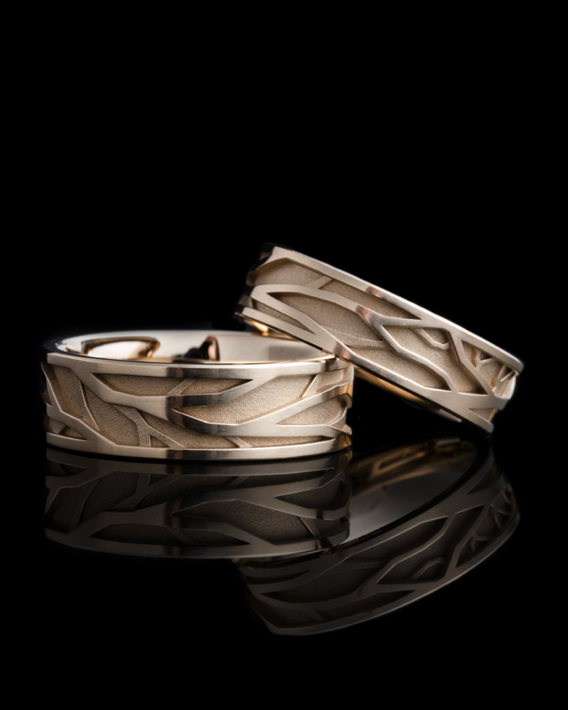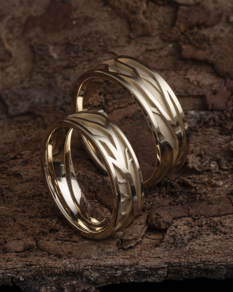 Nende abielusõrmuste muster on inspireeritud okstest ja kasvamisest.