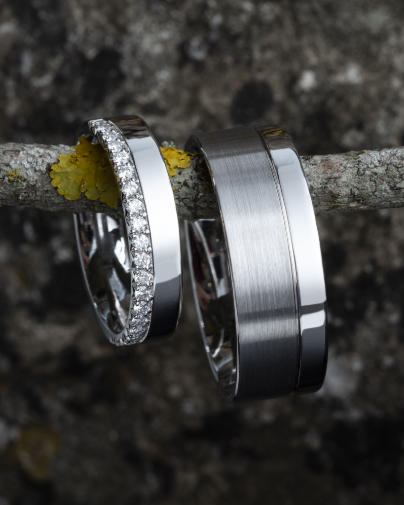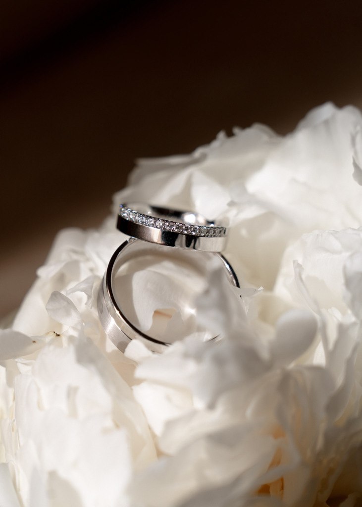 Lõpptulemus on täpne ja läbimõeldud: valgest kullast sõrmused, mis on vormilt puhtad, aga detailidelt erinevad. Emma sõrmust kaunistab sädelev teemantide rivi, Jorma sõrmus hoiab minimalistlikku joont mattide ja läikivate pindade vahel.